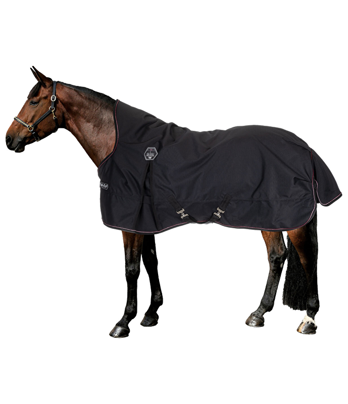 Wygodna, wyjątkowo wodoodporna, odporna na rozdarcia i oddychającaderka z wysokim kołnierzem (wodoodporność 5000 mm), wykonana z wytrzymałego materiału o grubości 1200 denierów z lekkim wypełnieniem o gramaturze 50 g, które gwarantuje optymalną cyrkulację powietrza. Wysokie zakładki, wraz z zaszewkami na ramionach, zapewniają optymalną swobodę ruchów i przestrzeń na ramionach, a także są luźno dopasowane i zapewniają kompleksową ochronę przed warunkami atmosferycznymi. Wewnętrzna wyściółka na kłębie zapobiega powstawaniu punktów ucisku i zwiększa komfort noszenia. Gładka, przyjazna dla futra podszewka. Wyposażony w proste zapięcie na haftkę w kształcie litery T przy klatce piersiowej, pasy krzyżowe. Można opcjonalnie połączyć z przedłużeniem klatki piersiowej.