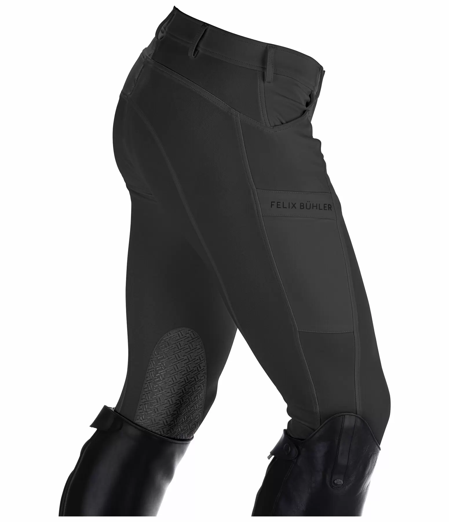 Nowoczesne bryczesy z silikonowymi lejami na kolanach. Dwie kieszenie z przodu i boczna kieszeń z patką i ukrytym otworem do bezpiecznego przechowywania smartfona podczas jazdy. Nadruk na kolanie zapewnia optymalną przyczepność w siodle. Wodoodporne, oddychające. 93% poliester, 7% elastan.