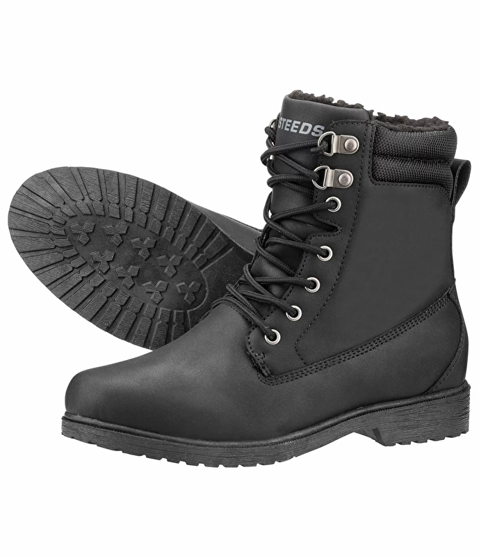 Solidne, sznurowane buty zimowe do stajni i rekreacji, wykonane z wytrzymałego materiału wierzchniego (poliuretan). Przytulna wyściółka wewnętrzna z pluszowego polaru utrzymuje stopy w cieple zimą, a wszyty z boku język zapobiega przedostawaniu się śniegu. Gumowa podeszwa zapewnia niezbędną przyczepność na śliskich nawierzchniach, takich jak śnieg, lód czy błoto, dzięki swojemu antypoślizgowemu profilowi. Podstawowy but zapewnia szczególny komfort dzięki praktycznym detalom, takim jak wyściółka kostki, wsuwana zakładka z tyłu i szybkie sznurowanie.