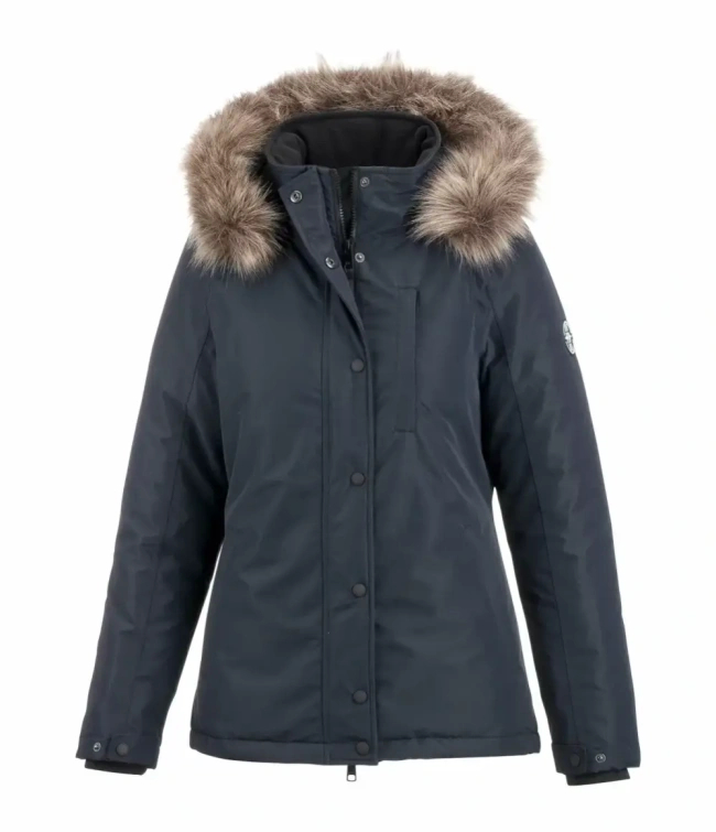Wysokiej jakości, funkcjonalna, damska kurtka jeździecka o dłuższym kroju i stylowym wyglądzie. Wodoodporny (5000 mm), wiatroszczelny i oddychający. Odpinany i regulowany kaptur z odpinanym kołnierzem ze sztucznego futra. Wypełnienie ze sztucznego puchu, regulowane mankiety z elastycznymi mankietami, 2 kieszenie zapinane na zamek, 1 kieszeń na piersi zapinana na zamek, kryty dwukierunkowy zamek z przodu, 2 rozcięcia z tyłu zapinane na zatrzaski, kaptur z możliwością zapięcia z tyłu. Naszywka Felixa Bühlera na rękawie, wewnętrznym kołnierzu i kapturze podszytym polarem.