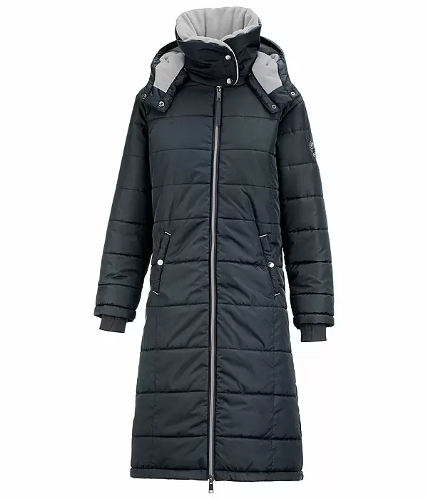 Nasz najcieplejszy i ekstra długi płaszcz jeździecki! Wysoki kołnierz podszyty przytulnym polarem, odpinany kaptur również podszyty polarem, mankiety z otworem na kciuk i tył z długim rozcięciem na suwak z dodatkową ochroną przed deszczem. Dwustronny zamek błyskawiczny z przodu, szlufki na nogi, 2 duże kieszenie z przodu z napami, 1 wewnętrzna kieszeń na suwak i ściągacz w pasie. Bardzo ciepła podszewka.