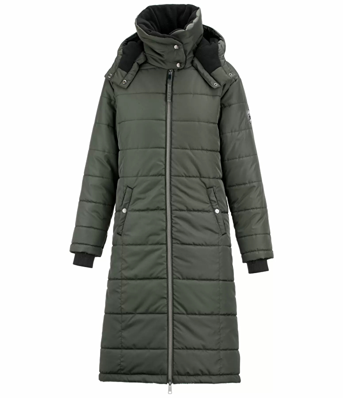 Nasz najcieplejszy i wyjątkowo długi płaszcz do jazdy konnej! Wysoki kołnierz podszyty przytulnym polarem, odpinany kaptur również podszyty polarem, mankiety z otworami na kciuki i tył z długim rozcięciem jeździeckim zapinanym na zamek z dodatkową ochroną przed deszczem. Dwukierunkowy zamek błyskawiczny z przodu, szlufki na nogi, 2 duże przednie kieszenie zapinane na zatrzaski, 1 wewnętrzna kieszeń na suwak i sznurek w talii. Bardzo ciepły.
