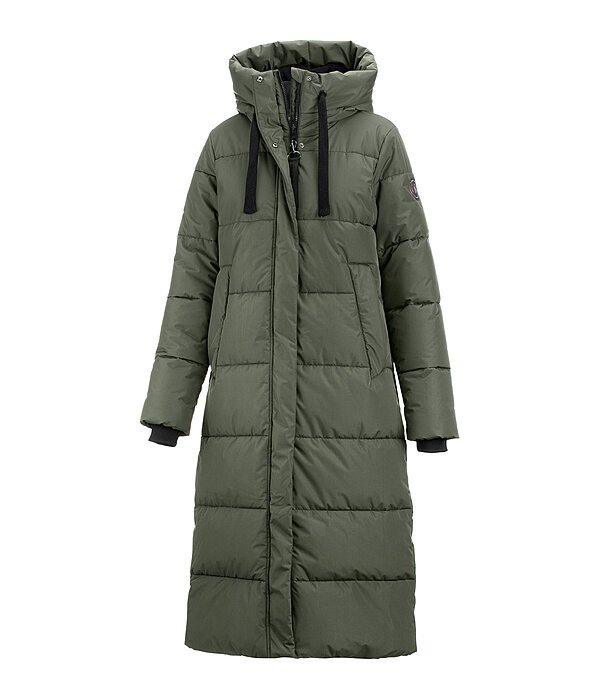 Prawdziwy ulubieniec, w którym można się przytulić! Niezwykle ciepły i wyjątkowo długi płaszcz do jazdy konnej o swobodnym, wygodnym kroju. Odporny na wiatr. Miękkie wypełnienie z imitacji puchu, kryty dwukierunkowy zamek błyskawiczny z osłoną podbródka, 2 kryte kieszenie zapinane na zamek z przodu wyłożone miękkim polarem, elastyczne mankiety, ściągacz w pasie i długie, podszyte rozcięcie do jazdy konnej z zamkiem błyskawicznym z tyłu. Bardzo wysoki, regulowany, wyściełany i podszyty polarem kaptur z możliwością dopięcia z tyłu. Wysokiej jakości odznaka Felixa Bühlera na piersi.