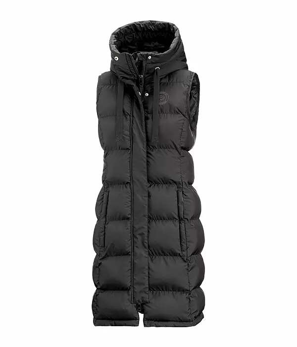 Długa kamizelka jeździecka z miękkim wypełnieniem z imitacji puchu. Bardzo wysoki regulowany i również wyściełany kaptur, który można zabezpieczyć z tyłu. Ukryty dwukierunkowy zamek błyskawiczny z przodu, 2 ukryte przednie kieszenie zapinane na zamek błyskawiczny podszyte miękkim polarem. Długie, podszyte rozcięcie jeździeckie z zamkiem błyskawicznym z tyłu, wysokiej jakości haft Felix Bühler na piersi.