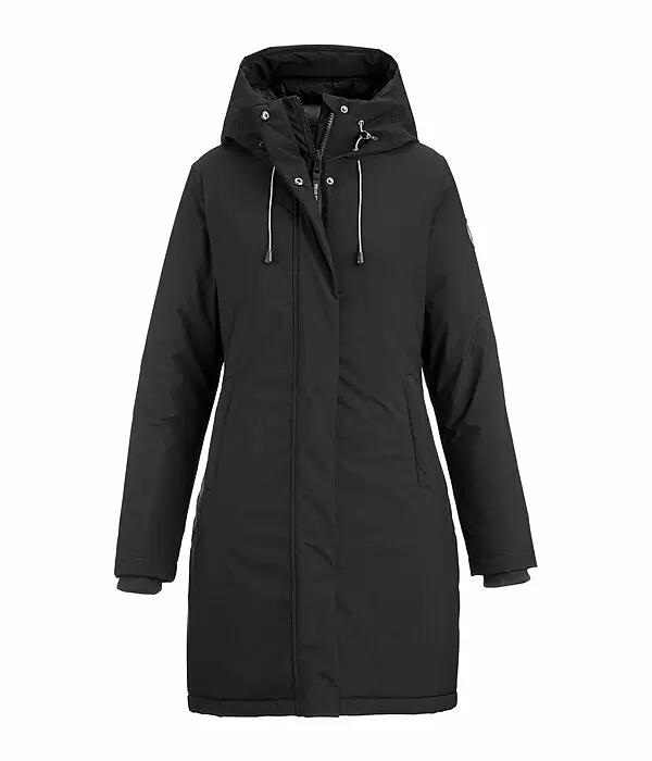 Długi, wyjątkowo ciepły zimowy płaszcz do jazdy konnej z bardzo wysokim kołnierzem i dużym, częściowo chowanym kapturem, który jest regulowany i zapinany z tyłu. Wodoodporna, wiatroszczelna i oddychająca. Wypełnienie z imitacji puchu, mankiety z elastycznym paskiem ze ściągacza, 2 przednie kieszenie zapinane na kryty zamek, z przodu kryty dwukierunkowy zamek błyskawiczny z osłoną podbródka, 1 rozcięcie jeździeckie zapinane na zamek z tyłu i 1 otwarta kieszeń wewnętrzna. Wewnątrz podszewka z subtelnym wytłoczonym wzorem, na rękawie naszywka Felix Bühler.