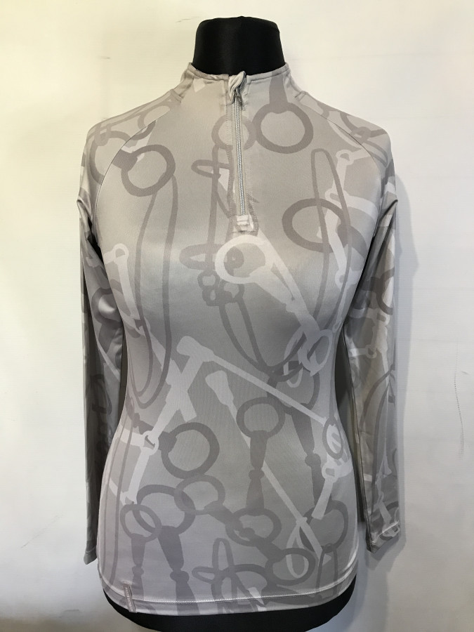 Miękka i elastyczna, funkcjonalna koszula z długim rękawem i eleganckim nadrukiem przedstawiającym motywy jeździeckie. Ze stójką i zamkiem błyskawicznym z osłoną podbródka. Oddychające i szybko schnące. 88% poliester, 12% elastan.