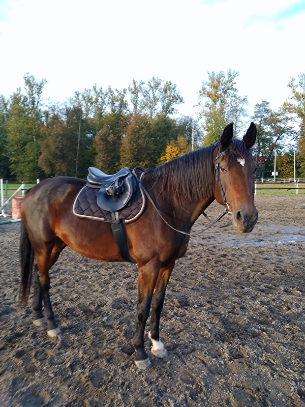 Pod naszą opieką Irish pracuje wszechstronnie na miarę naszych umiejętności: w klasycznym ujeżdżeniu pod siodłem, wyjeżdża w teren (sama lub z innymi końmi), sporadycznie skoki, aktualnie głównie na płasko, pracuje z ziemi na lonży oraz z elementami pracy "naturalnej" na linie. U poprzedniej właścicielki do 7 r.ż. użytkowana raczej sportowo, startując w zawodach skokowych. Natomiast nie szukamy dla niej człowieka, który będzie chciał konia do sportu.