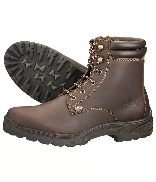 Wysokiej jakości solidne buty jeździeckie i stajenne wykonane z trwałej woskowanej skóry. Miękka wyściółka kostki i miękka wkładka dla najlepszego komfortu. Oddychająca podszewka z materiału tekstylnego (100% poliester). Solidna gumowa podeszwa profilowana z piętą gotową do jazdy zapewnia optymalną przyczepność na śliskich podłogach i strzemionach, amortyzująca wkładka jest wyjmowana. Szybkie sznurowanie umożliwia łatwe zakładanie.