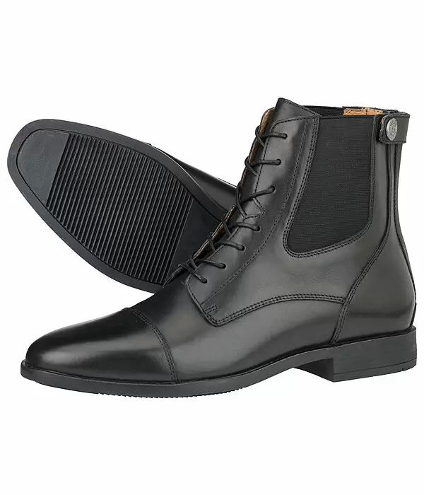 Botki sznurowane wykonane z najwyższej jakości brazylijskiej skóry licowej bydlęcej. Wewnętrzna wyściółka wykonana jest ze świńskiej skóry. Zamek błyskawiczny z tyłu umożliwia szybkie zakładanie, a elastyczne wstawki zapewniają wysoki komfort. Dalsze szczegóły obejmują amortyzującą wkładkę z wyjmowaną wkładką i solidną gumową podeszwę w smukłym kwadratowym kształcie.