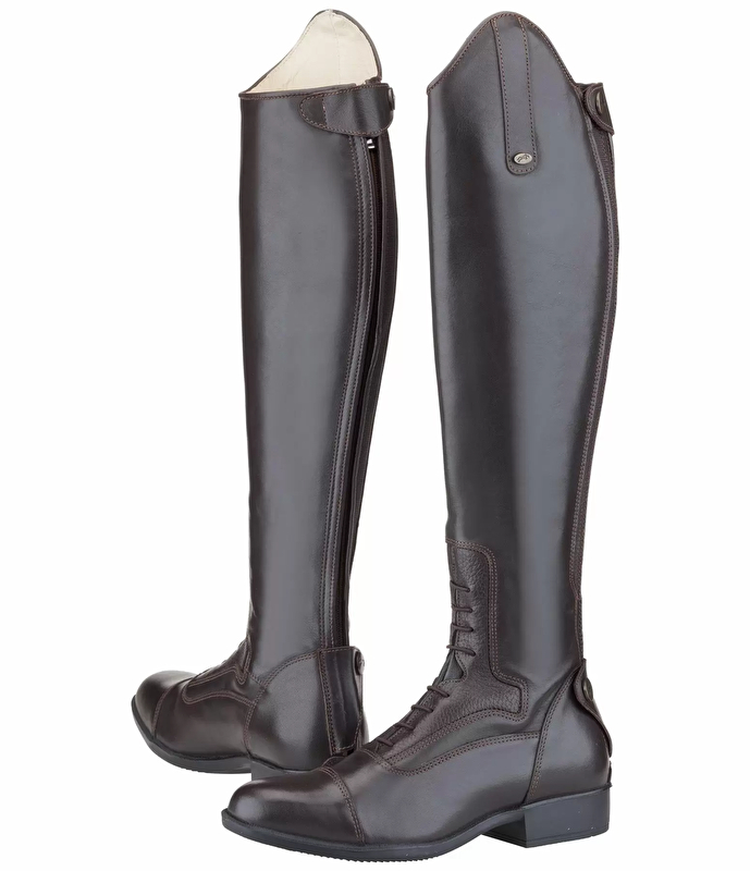 Eleganckie, sznurowane botki wykonane z włoskiej skóry licowej bydlęcej. Wysokiej jakości skóra jest przyjemnie miękka, a jednocześnie bardzo trwała. Wewnętrzna wyściółka wykonana jest z miękkiej świńskiej skóry. Zamek OPTI z tyłu z elastyczną wstawką po jednej stronie umożliwia idealne dopasowanie do indywidualnego kształtu łydki. W obszarze sznurowania zastosowano miękką, ziarnistą skórę, która wspiera głęboką piętę w strzemieniu. Obszar stóp wykonany jest w smukłym kwadratowym kształcie. Dalsze szczegóły obejmują amortyzującą wkładkę z wyjmowaną wkładką, odporną na ścieranie gumową podeszwę i ochronę przed ostrogami.