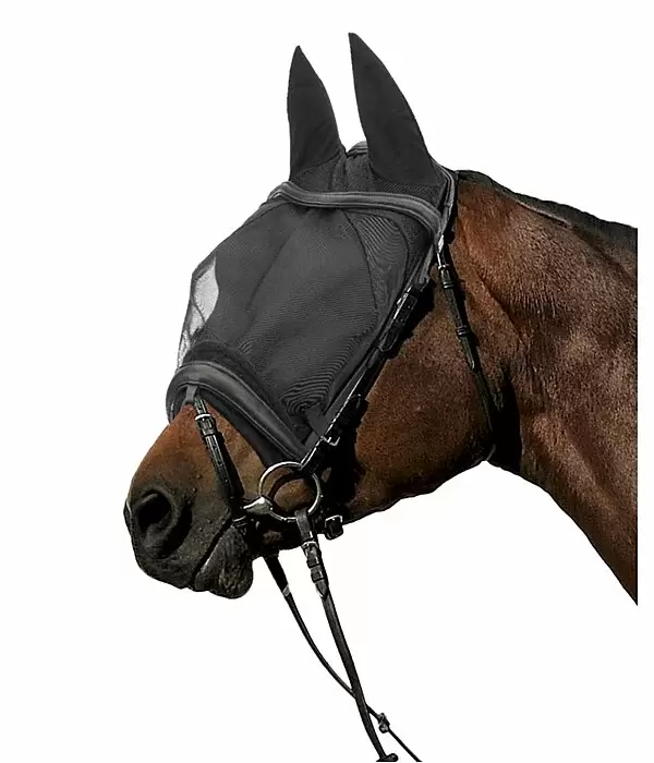 Innowacyjne połączenie. Obszar na górze wokół uszu wykonany jest z wyjątkowo lekkiego, przepuszczającego powietrze materiału siatkowego, a uszy są elastyczne. Obszar wokół oczu konia jest bezpiecznie chroniony przed irytującymi muchami przez gęstą czarną siatkę. Można go przymocować u góry do części nagłownej i po bokach do nachrapnika za pomocą elastycznych zapięć na rzepy. Krawędź przy pasku na nos pozostaje elastyczna i jest bezpiecznie i delikatnie zamykana przez elastyczną wkładkę. 100% poliester.