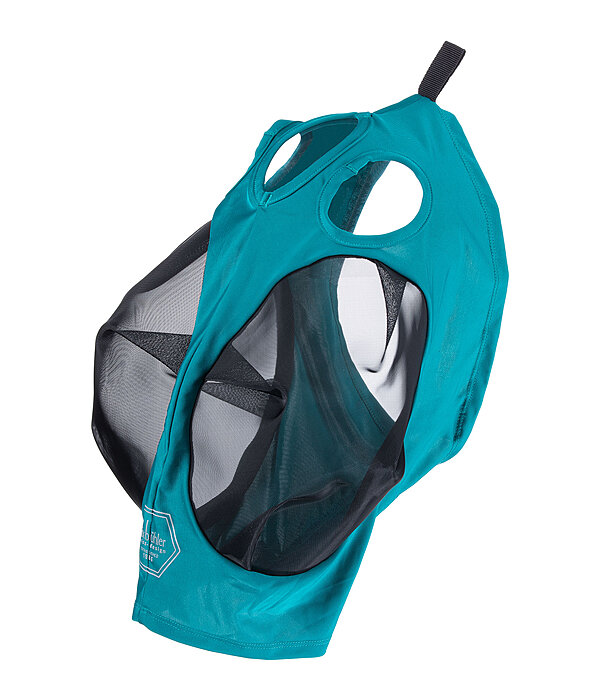 Dopasowana, elastyczna maska przeciw muchom z solidnym zamkiem błyskawicznym i dodatkowym zapięciem na rzepy dla pewnego dopasowania jak druga skóra. Duża część na oczy wykonana ze sztywnego, zachowującego kształt materiału siateczkowego, który zapewnia bezpieczną odległość od oczu i jest miękko podszyty polarem od wewnątrz. Lekki, wyjątkowo elastyczny materiał Lycra spełnia współczynnik ochrony UV UPF 50+, blokując co najmniej 97% promieniowania UV. Z wycięciami na uszy, wycięciem na czubek głowy i odblaskowym logo na grzbiecie nosa. Maska przeciw muchom 100% elastanu, materiał siateczkowy 100% nylonu.