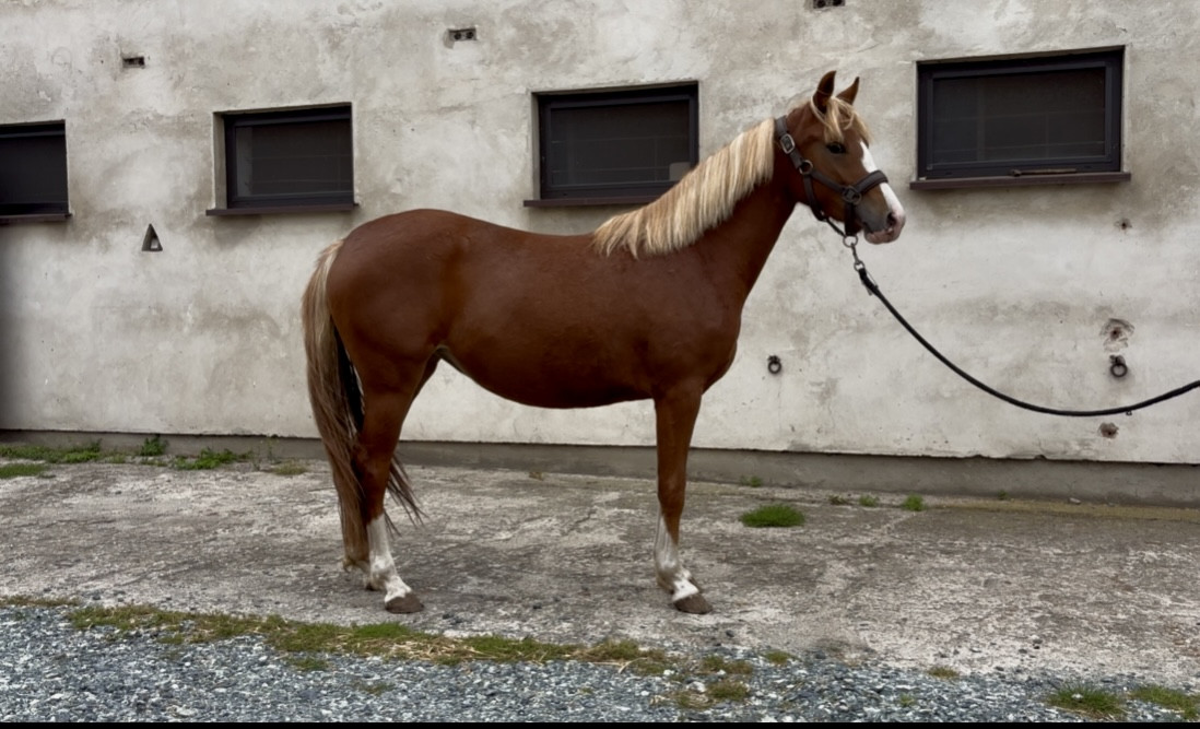 Sprzedam klacz z kwietnia 2023. Be Brave aktualnie mierzy 140 cm wzrostu, docelowo ponad 145. Rasa Polski kuc wierzchowy. Pięknie malowana, kasztanowata z jasną grzywą. Mocnej budowy, silne nogi i szyja. W przyszłości zarówno do skoków, jak i ujeżdżenia, ze względu na jej dość wszechstronne pochodzenie. Klacz własnej hodowli. Nigdy nie kontuzjowana. Padokwana w stadzie. Czyszczona i przywiązywana. Uczy się chodzenia na lonży. Regularnie szczepiona, odrobaczana i werkowana.