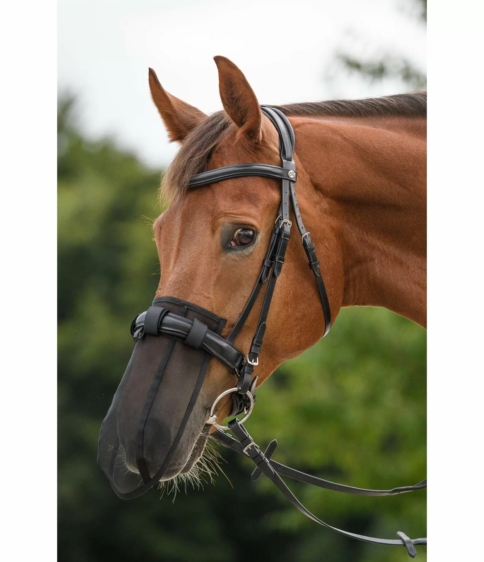 Skuteczna ochrona przed muchami i natychmiastowa ulga dla koni potrząsających głową. Chociaż pochodzenie potrząsania głową nie jest jeszcze znane, zauważyliśmy już, że zjawisko to całkowicie znika u prawie wszystkich koni z tą przypominającą pajęczynę ochroną nosa. Wystarczy przymocować do ogłowia lub uzdy. 100% poliester.