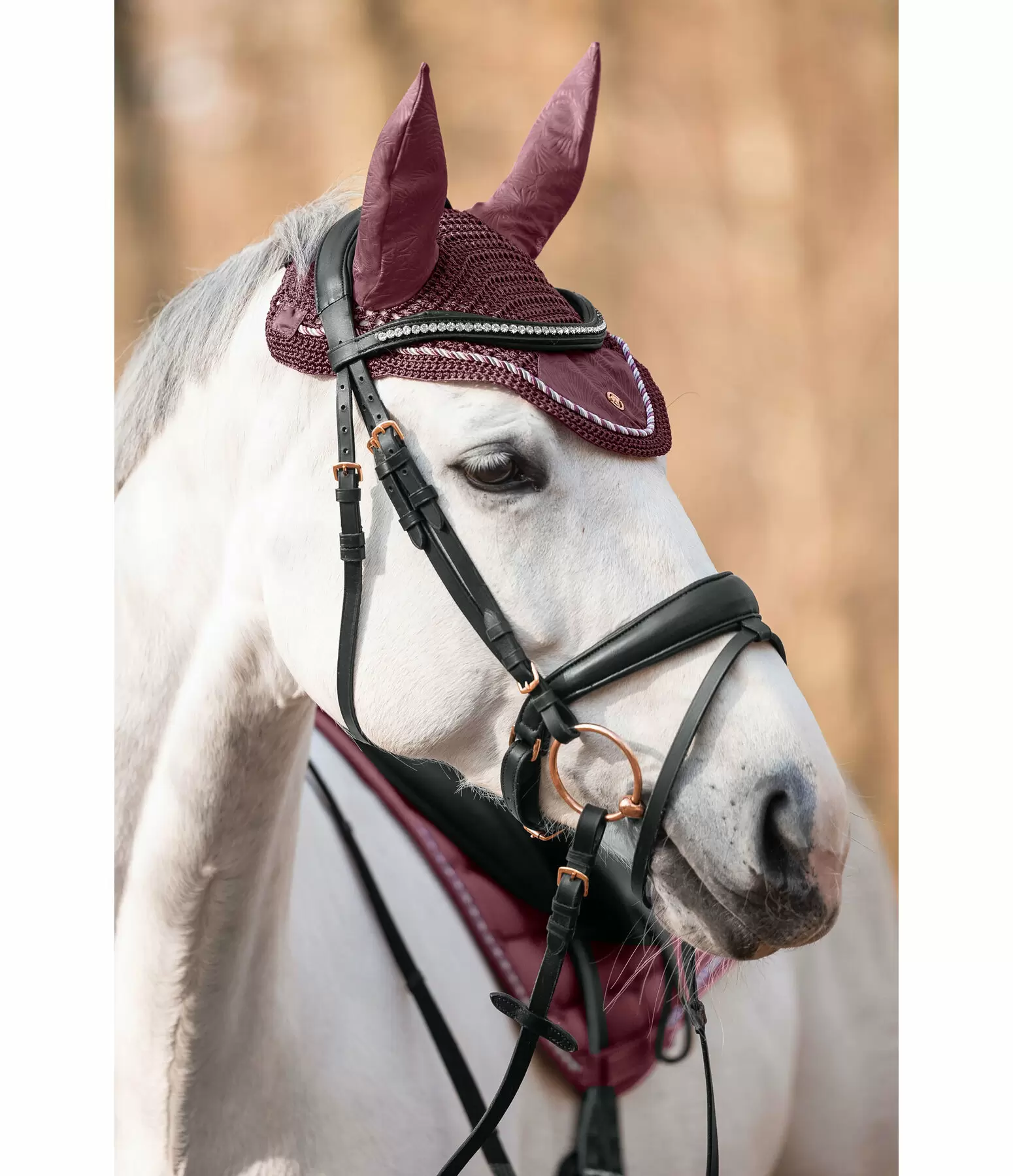 Szydełkowane nauszniki wykonane z mieniącej się przędzy z trójkolorowym ozdobnym sznurkiem i jedwabistą błyszczącą wstawką z wytłoczonym wzorem liści. Przyszyta, dyskretna płytka z logo liści. Nauszniki wykonane z elastycznego materiału z wytłoczonym wzorem. Z 2 elastycznymi rzepami do przymocowania do uzdy. Nauszniki 100% poliakryl, nauszniki 97% poliester, 3% elastan.