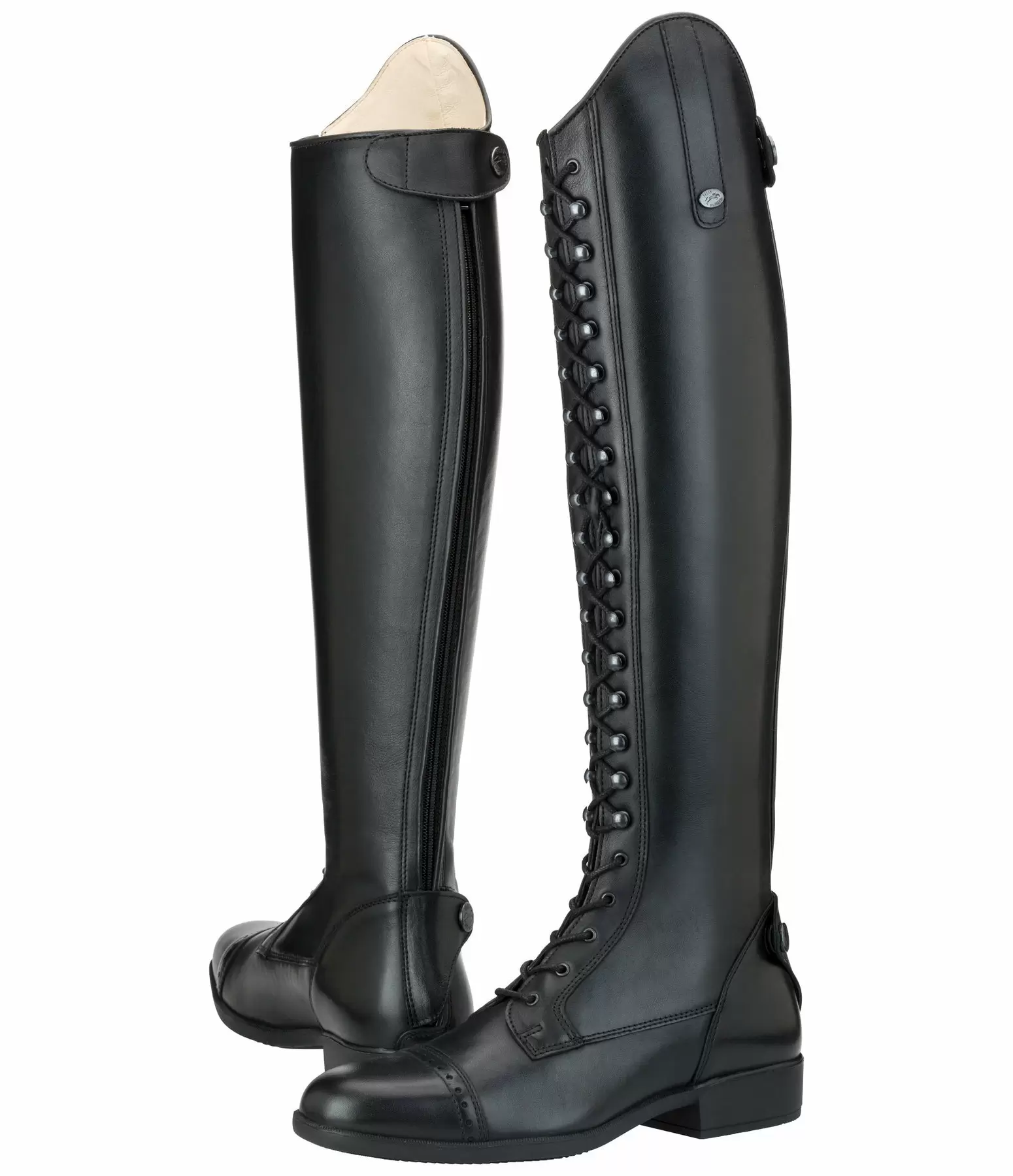 Szykowne, skórzane buty jeździeckie ze sznurowaniem z przodu, wykonane z włoskiej, licowej skóry bydlęcej! Szybkie sznurowanie z przodu gwarantuje idealne dopasowanie do indywidualnego kształtu łydki, natomiast górne, zamykane oczko pozwala na unieruchomienie sznurowadła. Za nim znajduje się skórzany język, dzięki czemu but pozwala na różną szerokość łydki bez konieczności stosowania elastycznej wkładki. Po zawiązaniu butów można je z łatwością zakładać i zdejmować za pomocą długiego zamka błyskawicznego z tyłu. Obszar stóp wykonany jest w smukłym kwadratowym kształcie. Dalsze szczegóły obejmują wewnętrzną wyściółkę wykonaną z miękkiej świńskiej skóry, amortyzującą wkładkę z wyjmowaną wkładką, odporną na ścieranie gumową podeszwę i ochronę przed ostrogami.