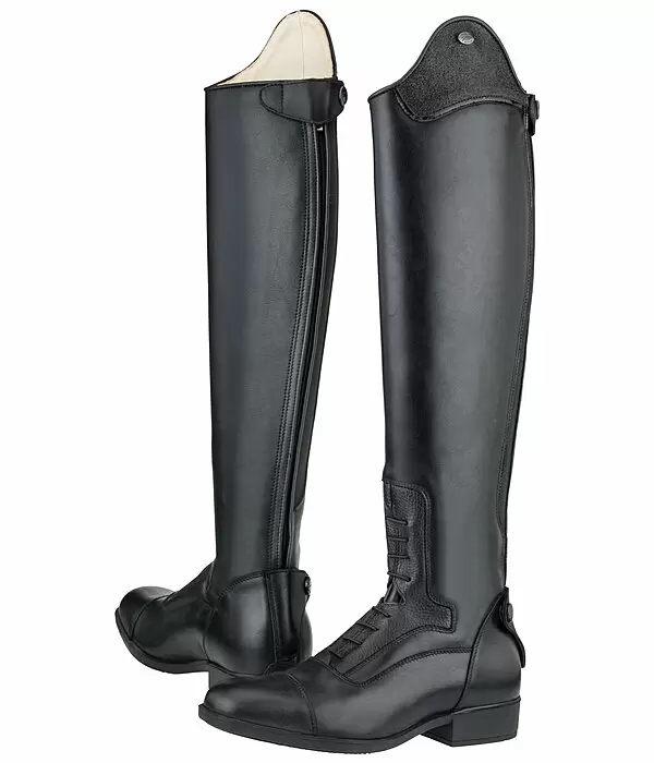 Oficerki z brokatową aplikacją z lakierowanym brzegiem na łuku ujeżdżeniowym. Eleganckie sznurowane botki wykonane z włoskiej skóry bydlęcej licowej. Ta wysokiej jakości skóra jest miękka i jednocześnie bardzo wytrzymała. Wyściółka wykonana jest z miękkiej świńskiej skóry. Z tyłu zamek z elastyczną wstawką po jednej stronie, dzięki której cholewki idealnie dopasowują się do każdej łydki indywidualnie. Wkładka z miękkiej skóry licowej pod i wokół sznurowadeł pomaga utrzymać głęboką pozycję pięty. Wąska, amortyzująca wkładka z kwadratowymi noskami, wyjmowaną wkładką, odporną na zużycie podeszwą zewnętrzną i podpórką na ostrogi.
