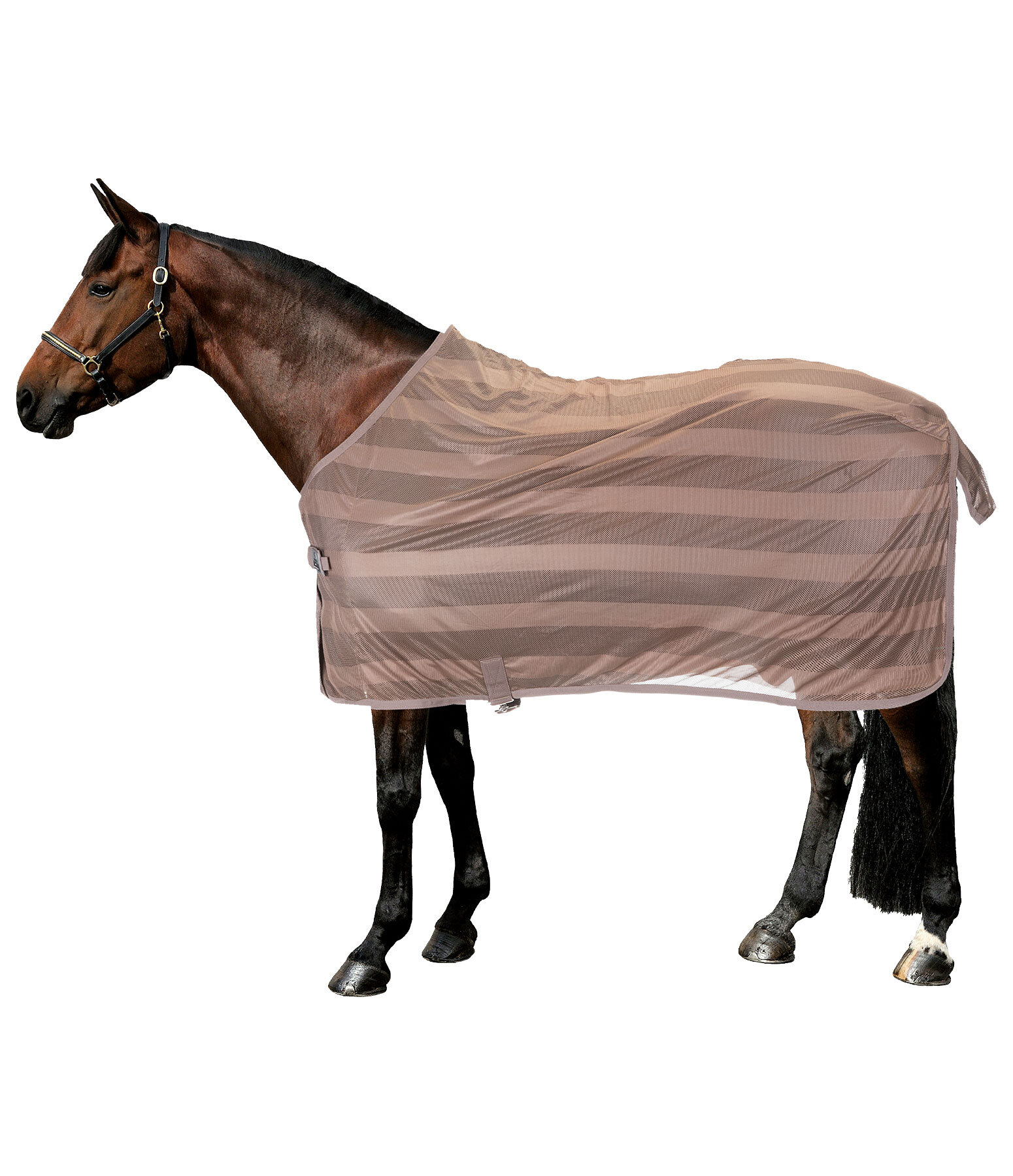 Ultralekka derka chłodząca na co dzień. Posiada proste zapięcie na froncie, które zapobiega ślizganiu się. Idealny przed treningiem jako niezawodna ochrona przed irytującymi owadami. Bardzo pomocny również w podróży lub podczas letnich spacerów. Dzięki lekkiemu materiałowi (75 Denier) derkę można szybko i łatwo zdjąć! Materiał zmienia się w pasiasty wzór między gęsto oczkami i innymi oddychającymi siatkami, dzięki czemu można zapewnić dobrą oddychalność dywanu. 100% poliester.