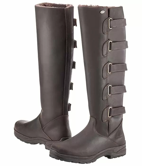 Buty zimowe z wytrzymałej woskowanej skóry. Wewnętrzna wyściółka wykonana jest z prawdziwej wełny owczej i gwarantuje przyjemne ciepło stóp i nóg. Pięć pasków zapinanych na rzepy ułatwia szybkie zakładanie butów i umożliwia dopasowanie buta do różnych rozmiarów łydek. Wytrzymały profil podeszwy zapewnia jeźdźcowi lepszą przyczepność w strzemionach i na padoku.