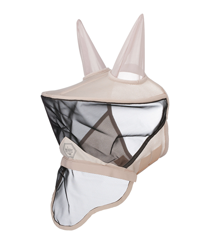 Maska przeciw muchom inspirowana sprzętem ochronnym pszczelarzy, z wyjmowanym nozdrzem i filtrem UV, wykonana z wyjątkowo oddychającej siatki Moisture Vapor Transmission (MVT), która umożliwia stałą cyrkulację powietrza pod maską i zapobiega gromadzeniu się ciepła. Idealna ochrona uszu, oczu i nozdrzy przed uciążliwymi komarami i innymi insektami. Gęsto osadzone i wyjątkowo wytrzymałe siatki ripstop ze zintegrowanym pierścieniem, który gwarantuje wyjątkowo wygodną odległość między materiałem siatki a oczkami i pozostaje na swoim miejscu nawet podczas turlania się i hasania. Dodatkową ochronę wrażliwego nosa konia zapewnia anatomicznie ukształtowany ochraniacz nozdrzy, który można zdjąć za pomocą KV, dzięki czemu nozdrza pozostają wolne, co zapobiega podrażnieniom lub ograniczeniom oddechu konia. Z miękkim polarowym wykończeniem dookoła, zapobiegającym otarciom. Nauszniki wykonane z elastycznego, perforowanego materiału rozciągliwego. Podwójne zapięcie na rzep zapewniające bezpieczne trzymanie. Ochrona UV 60%+. 100% poliester.