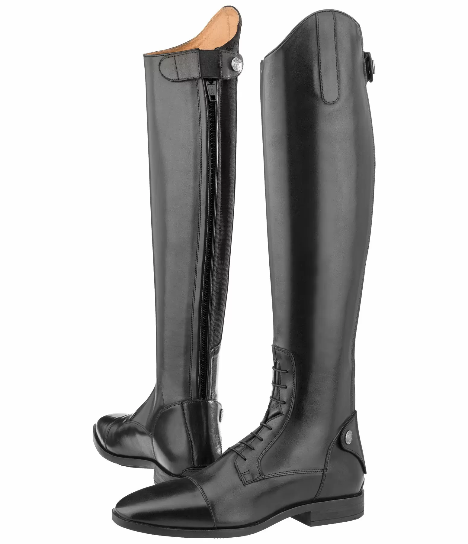 Buty jeździeckie Brasilia zachwycają doskonałym dopasowaniem. Cholewka wykonana z licowej brazylijskiej skóry bydlęcej, która od samego początku jest niezwykle miękka na nodze. Wewnętrzna wyściółka wykonana jest z miękkiej świńskiej skóry. Elastyczne sznurowanie na podbiciu pozwala na smukły krój w kostce i zapewnia maksymalny komfort podczas jazdy i biegania. Wyjątkowo wytrzymały zamek błyskawiczny gwarantuje długą żywotność, zabezpieczenie przed wciśnięciem ostrogi chroni zamek błyskawiczny. Zintegrowana elastyczna wstawka na zewnątrz cholewki umożliwia dopasowanie do indywidualnego kształtu łydki. Solidna gumowa podeszwa o smukłym, kwadratowym kształcie z żebrowanym profilem w obszarze kulki zapewniającym doskonałą przyczepność w strzemieniu. Wyjmowana wkładka posiada amortyzującą piankę na pięcie i zapewnia wysoki poziom komfortu.