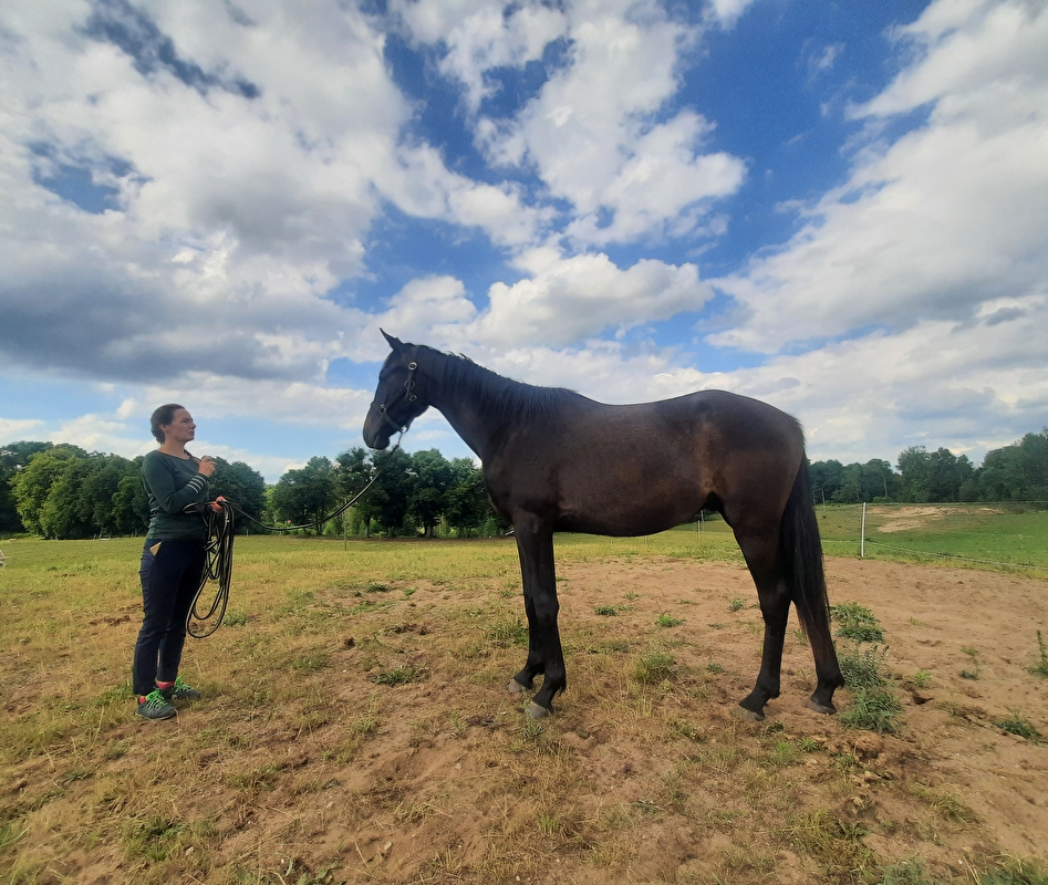 Jest grzeczny i przyjacielski, podaje nogi, chodzi na uwiązie, jest zajezdzony w trzech chodach, stęp, klus, galop (nie jest typem buntownika ani wyszukiwaczem dziur w całym, jest raczej podporządkowujący się). Zaczął rowniez pracę na kawaletkach.