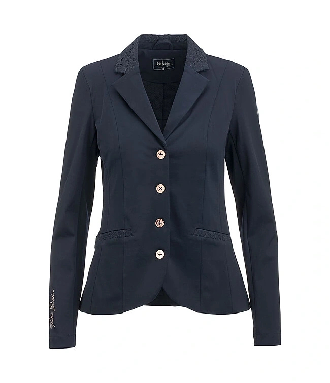 Piękny, dopasowujący się do sylwetki frak dla kobiet z koronkowymi wstawkami na kołnierzu. Wykonany z materiału rozciągliwego, oddychającego i szybkoschnącego. 2 naszyte kieszenie, również obszyte koronką, z guzikami w kolorze różowego złota i haftem Felixa Bühlera na rękawie. 73% poliamid, 27% elastan.