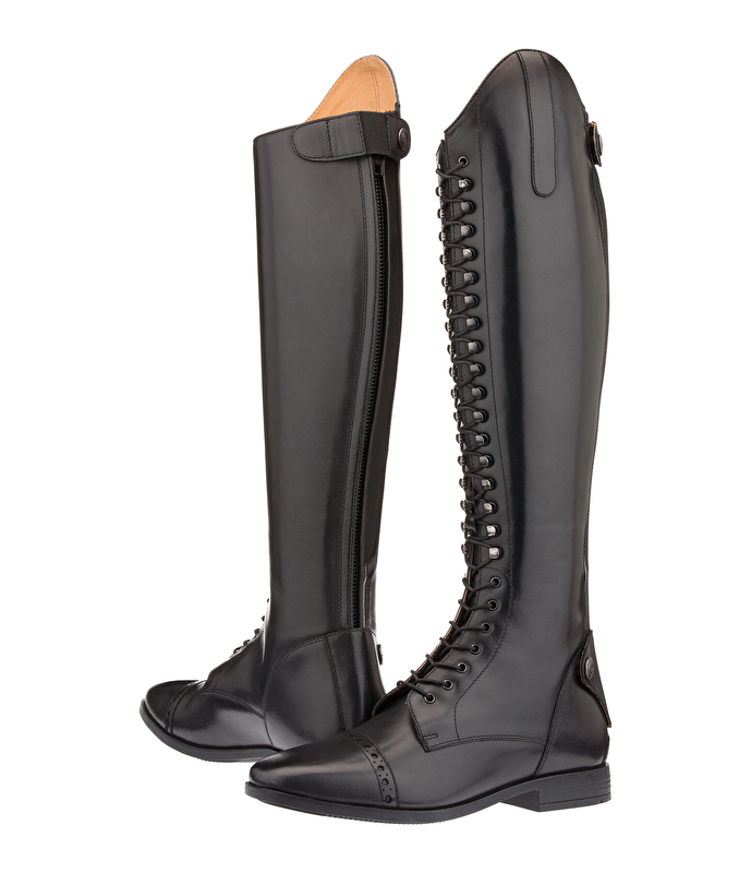 Eleganckie skórzane buty jeździeckie ze sznurowaniem z przodu, wykonane z licowej brazylijskiej skóry bydlęcej. Po dopasowaniu za pomocą szybkiego sznurowania z przodu, wystarczy zapiąć zamek błyskawiczny z tyłu i but jeździecki pasuje idealnie. Skórzany język znajduje się za przednim sznurowaniem, dzięki czemu można dopasować but do różnej szerokości łydki. Zintegrowana elastyczna wstawka na zewnątrz cholewki pozwala na dopasowanie jej do indywidualnego kształtu łydki i zapewnia niezbędny komfort. Wewnętrzna wyściółka wykonana jest z miękkiej świńskiej skóry.