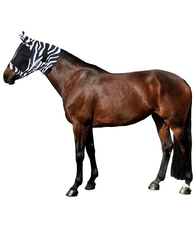Obszerna, dobrze dopasowana maska przeciw egzemom, wykonana z elastycznego i oddychającego materiału funkcjonalnego (ochrona UV UPF 50+) dla koni szczególnie wrażliwych na komary. Badania wykazały, że czarno-biały wzór zebry przede wszystkim odstrasza owady od siadania na koniu. Siatka przeciw owadom o gęstych oczkach ze szwem dystansowym w polu widzenia zapewniającym bezpieczną odległość od oczu, która blokuje co najmniej 50% promieniowania UV, a jednocześnie zapewnia dobrą widoczność. Idealna regulacja rozmiaru dzięki zamkowi błyskawicznemu i systemowi KV z elastycznymi wstawkami. Można idealnie połączyć z kocem na egzemę zebry Felixa Bühlera Gibson