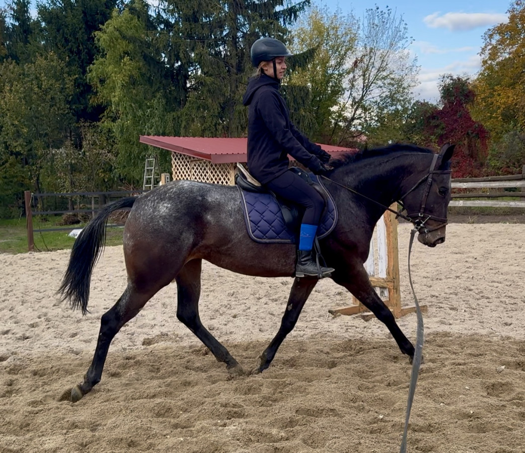 Porusza się w stępie i kłusie pod jeźdźcem (na lonży), nic nie robi na niej większego wrażenia, na nowe rzeczy reaguje z opanowaniem, w trakcie zajeżdżania.