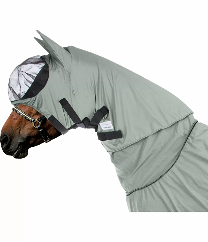 Chroni wrażliwą skórę głowy i okolic oczu konia. Łatwe mocowanie za pomocą rzepów na spodniej stronie szyi i elastycznej taśmy na końcu części szyi. Odporny na promieniowanie UV. Możliwość dopasowania do derki.