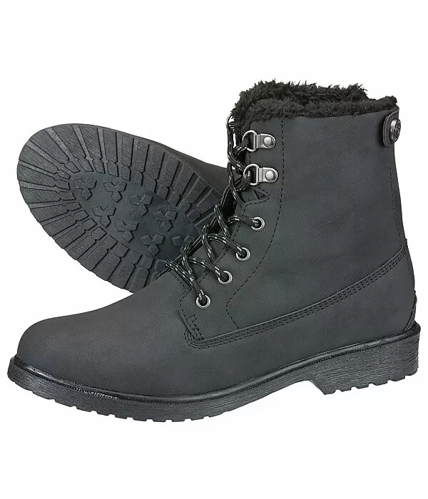 Zimowe buty jeździeckie z zamkiem z tyłu umożliwiającym szybkie zakładanie i zdejmowanie. Przytulna wyściółka wewnętrzna z polaru pluszowego utrzymuje stopy w cieple zimą, wierzchni materiał to skóra syntetyczna. Wszyty język z boku zapobiega przedostawaniu się śniegu. Kolejnymi cechami są szybkie sznurowanie i gumowa podeszwa z piętą odpowiednią do jazdy konnej.