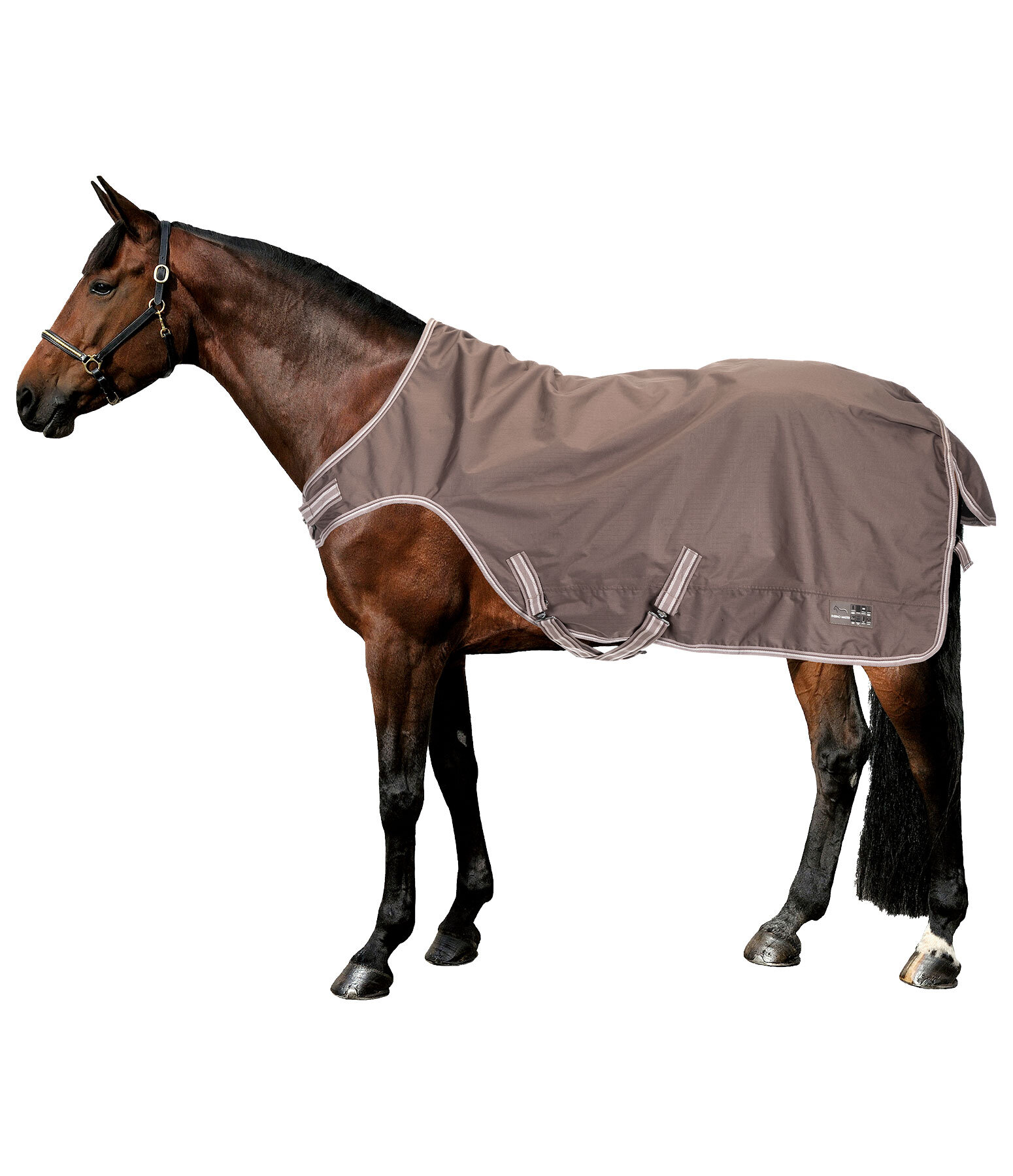 Dla maksymalnej swobody ruchu: ta wodoodporna i oddychająca derka do użytku na zewnątrz ma duże wycięcie w przedniej części nogi, wykonany z materiału ripstop 600 denierów (3000 mm słupa wody) bez wyściółki. Niezawodnie chroni okolice nerek i tułów przed wilgocią i wiatrem. Idealny do lonżowania, spacerów lub korzystania z chodzika dla koni. Posiada proste zapięcie na klatkę piersiową w kształcie litery T i dodatkową osłonę podbródka, regulowane pasy krzyżowe oraz regulowany na długość pasek na ogon i klapę na ogon. Gładka, przyjazna dla sierści podszewka. 100% poliester.
