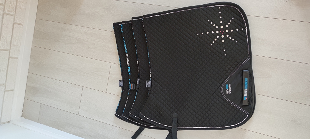 Posiadam na sprzedaż 3 sztuki czapraka Premier Equine DL FULL. Czapraki w modelu tradycyjnym cotton zostały przyozdobione cyrkoniami. Wszystkie są wykonane wręcz identycznie, większość cyrkonii jest na miejscu. Ich stan jest dobry, nie posiadają większych uszkodzeń. Były prane na szybko, więc od wewnątrz są przybrudzone. Cena za sztukę to 80zł.