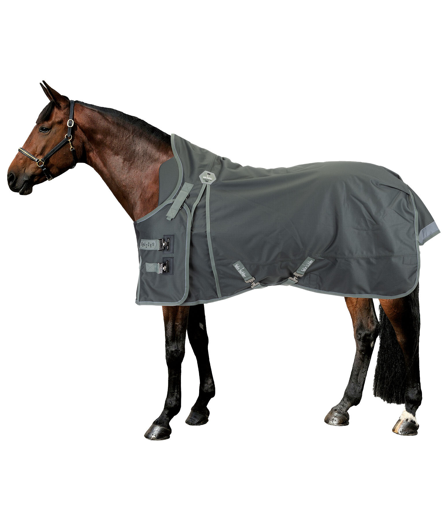 Nowatorsko zaprojektowana, wytrzymała derka wykonana z materiału o grubości 1200 denierów (5000 mm słupa wody), z lekkim wypełnieniem i wyszukanym, potrójnym zapięciem bocznym w kształcie litery T z dodatkowym KV. Dzięki temu obszar klatki piersiowej jest wolny od klamer i haczyków, co zapewnia dodatkowe bezpieczeństwo, na przykład podczas jedzenia z siatki na siano, ponieważ derka nie może zaplątać się w materiał siatkowy. Wyściełany wysoki kołnierz i podwójne kliny w okolicach ramion i przodu zapewniają większą swobodę ruchów. Wygodne wkładki elastyczne w przedniej części szyi/klatki piersiowej wykonane z elastycznego, wysoce hydrofobowego materiału softshell zapobiegają otarciom i umożliwiają wygodne opuszczenie głowy. Wyściełane naramienniki zapewniają optymalny rozkład nacisku i zapobiegają tarciu. Odblaskowe lamówki i klapa ogonowa z odblaskowymi paskami biegną dookoła. Gładka, przyjazna dla sierści podszewka, pasy krzyżowe i regulowany pasek podbródkowy. 100% poliester.
