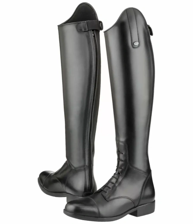 Buty jeździeckie wykonane z miękkiej, licowej skóry bydlęcej o najlepszym wykonaniu, przeznaczone do codziennych treningów i zawodów. Zintegrowana elastyczna wstawka na zewnątrz cholewki i elastyczne sznurowanie z przodu zapewniają optymalne dopasowanie i wysoki komfort noszenia. Wąski krój w kostce i wydatny łuk cholewki nadają nodze pełen wdzięku wygląd. Wysokiej jakości zamek błyskawiczny OPTI z tyłu buta gwarantuje długą żywotność, a zatrzask na górnym końcu cholewki zapobiega rozpinaniu się zamka podczas jazdy. Wewnętrzna wyściółka wykonana z oddychającej tkaniny tekstylnej (100% poliester). Gumowa podeszwa zewnętrzna o smukłym, kwadratowym kształcie i żebrowanym profilu zapewnia optymalną przyczepność w strzemieniu. Wyprodukowano w Portugalii.