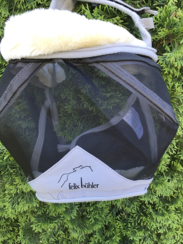 Wytrzymała i lekka maska przeciw owadom bez części nausznych: Miękko wyściełany pasek na szyję pokryty polarem można całkowicie otworzyć i płynnie regulować. Szczególnie odpowiedni dla koni z wrażliwymi uszami, które nie lubią, gdy coś jest naciągane na uszy. Siatka przeciw owadom o gęstych oczkach ze szwem dystansowym w polu widzenia zapewniającym bezpieczną odległość od oczu i dobrą ochronę przed komarami i owadami. Siatka na oczy o drobnych oczkach blokuje co najmniej 50% promieniowania UV, zapewniając jednocześnie dobre widzenie. Wewnętrzna, przytulna wyściółka z pluszowego polaru na grzbiecie nosa i czoła oraz obszycie z polaru dookoła, aby zapobiec otarciom. 100% poliestru.