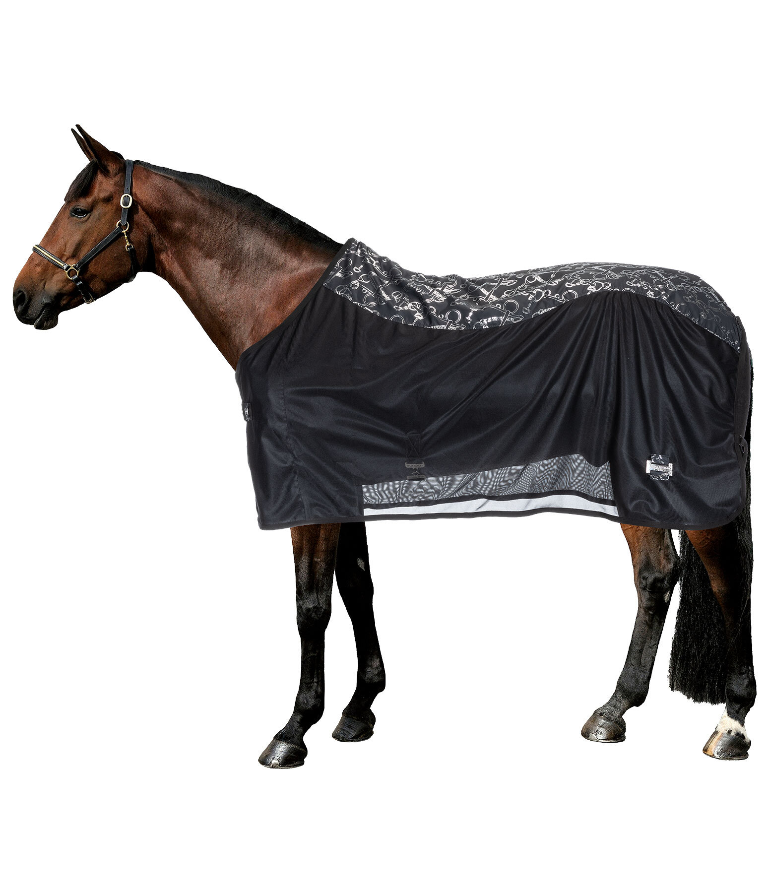 Absolutnie przyciągający wzrok wśród derek przeciw muchom! Ta stylowa, lekka derka przeciw muchom wykonana z cienkiej siateczki z błyszczącym nadrukiem na całej powierzchni. Nadrukowany panel zapewnia również ochronę przed przeciągami dla wrażliwego grzbietu konia i okolic nerek. Dzięki temu derka ta idealnie nadaje się do transportu, zawodów lub jako lekka chłodziarka w miesiącach letnich po pracy. Posiada odpinany pasek na brzuch po obu stronach, proste zapięcie na klatkę piersiową w kształcie litery T i regulowany pasek na ogon. Obszar ramion i plecy są podszyte, aby chronić sierść. 100% poliester.