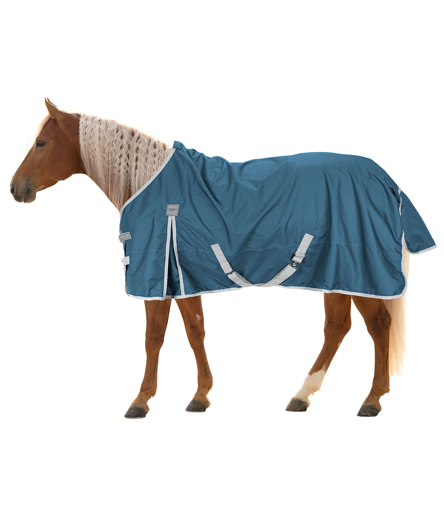 Niepodszyta derka przeciwdeszczowa dla koni w stylu western. Wodoodporna i oddychająca (3000 mm słupa wody). Z klinem zapewniającym optymalną swobodę ruchu, podwójnym zapięciem na klatkę piersiową w kształcie litery T z dodatkowym ochraniaczem podbródka, regulowanymi pasami poprzecznymi i klapą na ogon. Zawiera urządzenie do mocowania pasów na nogi i regulowany pasek na ogon. Gładka, przyjazna dla sierści podszewka. 100% poliester.