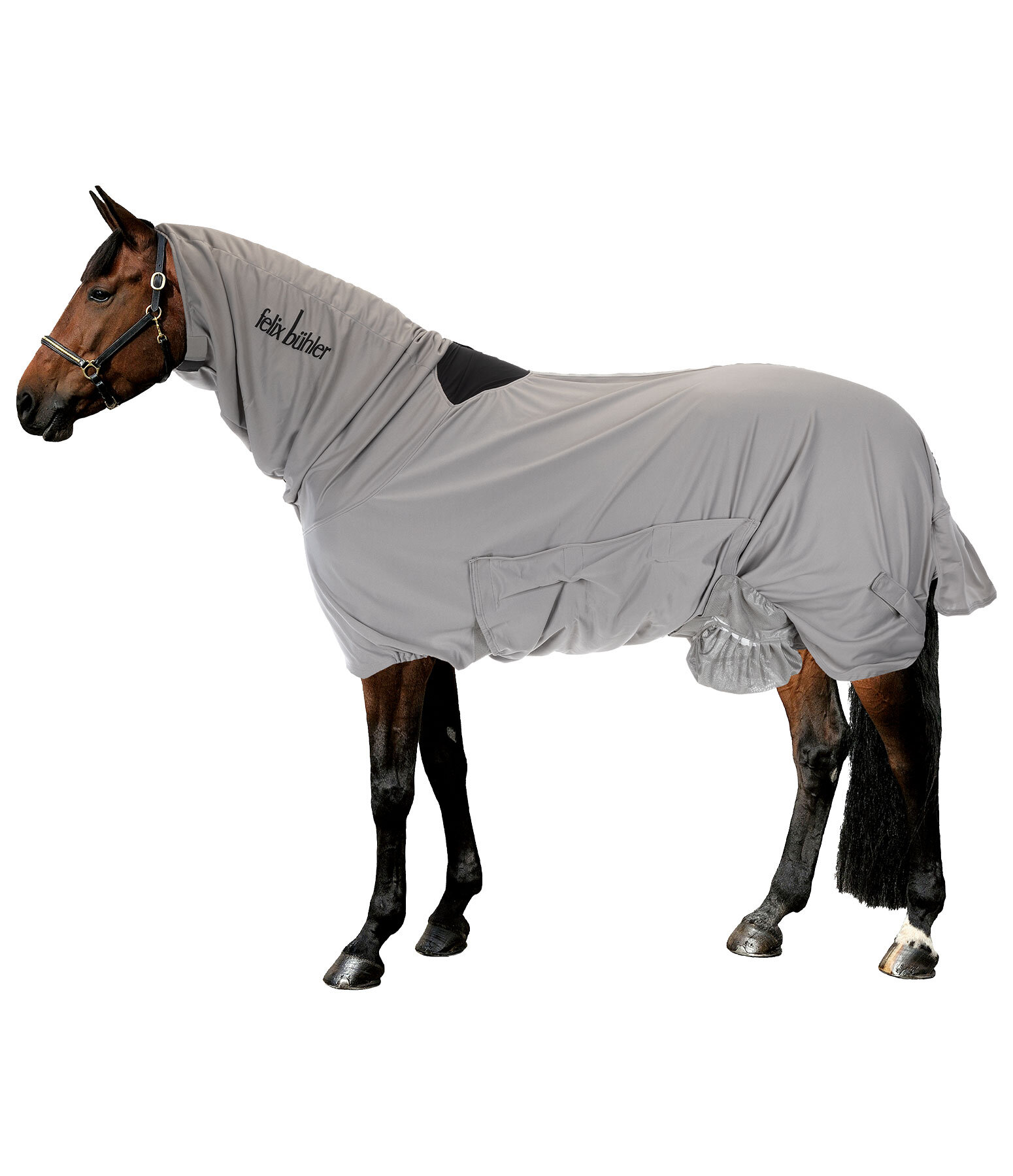 Innowacyjna, dobrze dopasowana derka na egzemę wykonana z elastycznego i oddychającego materiału funkcjonalnego, który blokuje co najmniej 97% promieniowania UV, a tym samym zapewnia niezawodną ochronę przeciwsłoneczną (odpowiednik UPF 50+). Nadaje się dla koni szczególnie wrażliwych na komary. Sekcje szyi i ciała wykonane są z jednego kawałka, aby zapewnić optymalną ochronę przed owadami. Z pętlą KV na sekcji szyi do przymocowania do kantara. Lekka, szczególnie elastyczna wkładka na kłębie minimalizuje nacisk. Całkowita ochrona dzięki obszernej, elastycznej klapie na brzuch i podwójnej klapie na ogon. Zdejmowana ochrona narządów płciowych i wymion wykonana z przepuszczającego powietrze i wilgoć materiału siatkowego chroni przed meszkami. 100% poliester.