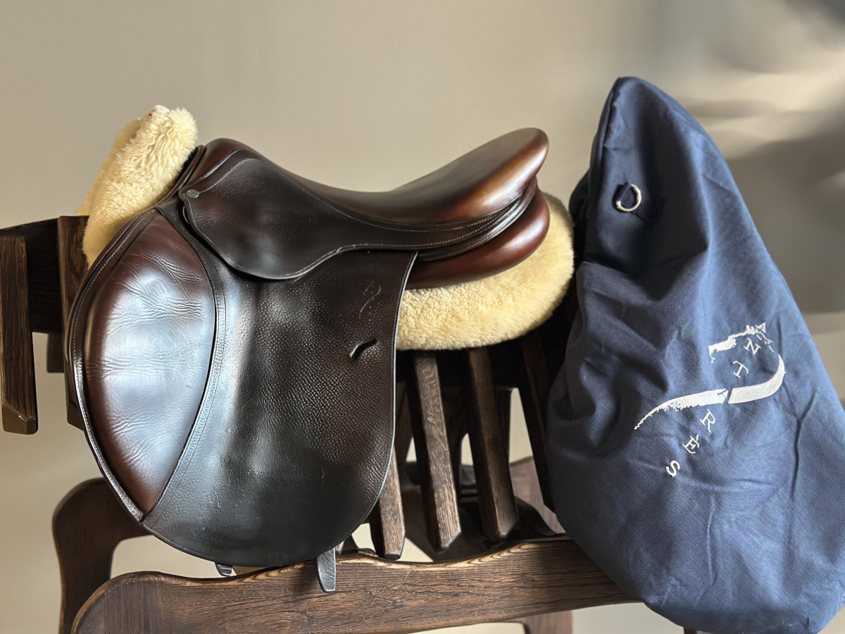 PL: Siodło skokowe z półgłębokim siedziskiem, zapewniające stabilną pozycję jeźdźca i dobry kontakt z koniem.