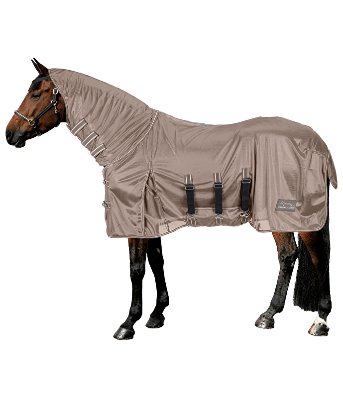 Wszechstronna ochrona przed muchami o doskonałym stosunku ceny do wydajności! Klasyczna derka muchowa z przyszytą częścią szyjną i dużym klinem zapewniającym optymalną swobodę ruchów. Materiał o drobnych oczkach blokuje co najmniej 70% promieniowania UV, zapewniając tym samym dodatkową ochronę przeciwsłoneczną. Elastyczny naczółek zabezpieczający szyję nawet bez kantara. Regulowane podwójne zapięcie na klatce piersiowej i 3 KV na szyi zapewniają dobre dopasowanie rozmiaru i bezpieczne zamknięcie koca. Gładka, przyjazna dla futra wyściółka wewnętrzna w okolicy grzywy, ogona i ramion. Regulowana klapa na brzuch z elastycznymi wstawkami, obszerna klapa na ogon i sznurek na ogon. Możliwość zamontowania opcjonalnych pasków na nogi. 100% poliestru.