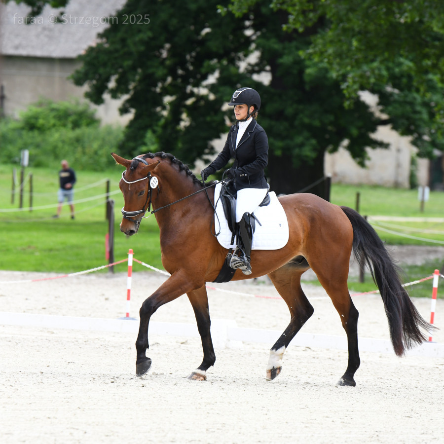 Pierwszy start w L klasie w czerwcu 2025 - 2miejsce w Rundzie, gotowy na P klasę, robi zagalopowania ze stępa, zatrzymania, ustępowania, dodania, koła 15m, bardzo szybko uczy się nowych rzeczy