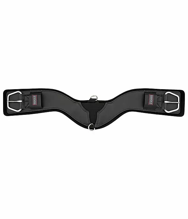 Anatomicznie wycięty popręg brzuszny, który dzięki swojemu kształtowi i elastycznej środkowej części optymalnie dopasowuje się do konia. Szeroka powierzchnia styku zapewnia optymalny rozkład nacisku. Wyjmowana guma chloroprenowa ułatwia czyszczenie popręgu. Powierzchnia wykonana jest z wytrzymałej imitacji skóry. Z pierścieniami D i klamrami ze stali nierdzewnej.