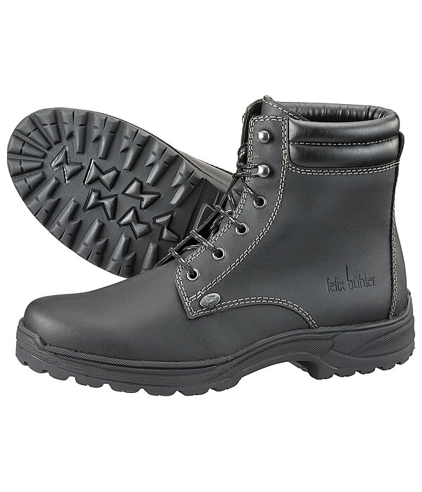 Wysokiej jakości solidne buty stajenne i jeździeckie wykonane z wytrzymałej skóry woskowanej. Miękka wyściółka kostki i miękka wkładka zapewniają najwyższy komfort. Oddychająca tekstylna wyściółka. Solidna gumowa podeszwa z gotowym do jazdy obcasem zapewnia optymalną przyczepność na śliskich podłogach i strzemionach, amortyzująca wkładka jest wyjmowana. Szybkie sznurowanie umożliwia łatwy dostęp.
