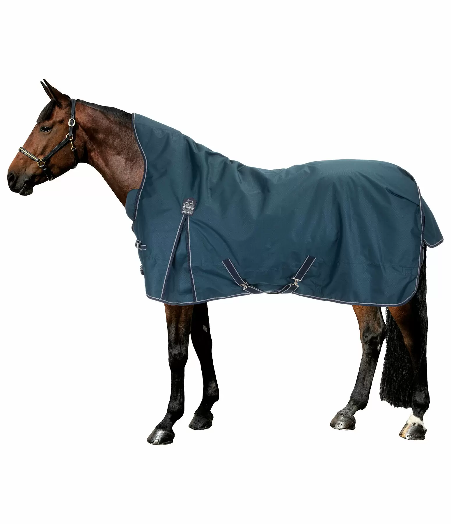 Innowacyjna derka zewnętrzna z wysokim kołnierzem chroniącym przed wnikaniem wody i zapobiegającym otarciom w okolicy kłębu, a także miękkie, boczne naramienniki (podszewka z polaru), które zapewniają optymalny rozkład nacisku nawet przy opuszczonej głowie konia. Wykonana z oddychającego i wodoodpornego materiału ripstop 600 denierów (3000 mm słupa wody, klejone szwy) z subtelnym wytłoczeniem znaku wodnego. Miękka podszewka z polaru (bez dodatkowego wypełnienia) i gładka, przyjazna dla sierści podszewka w okolicach barków i klatki piersiowej. Podwójne, regulowane zapięcie z przodu z kółkami w kształcie litery D i karabińczykami, a także dodatkowy ochraniacz podbródka i regulowane pasy krzyżowe. Zawiera urządzenie do opcjonalnego mocowania pasków na nogi, regulowany na długość pasek podogonowy i klapę na ogon. 100% poliester.