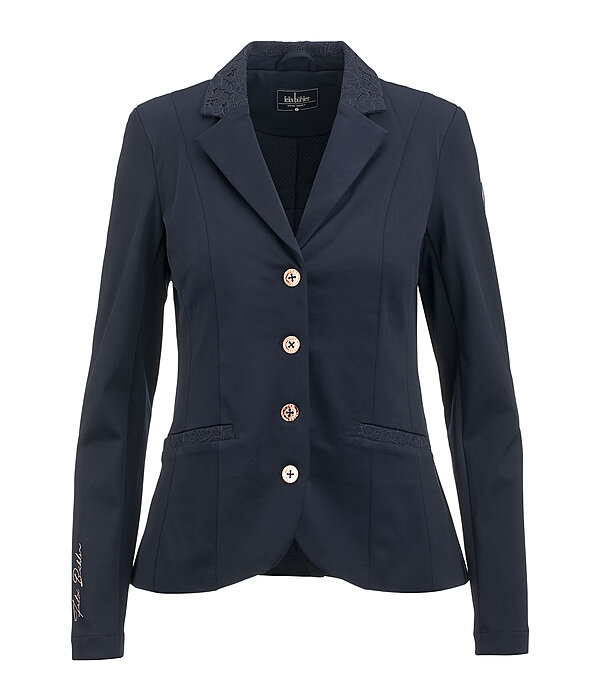 Piękna, dopasowana do sylwetki marynarka konkursowa dla kobiet z koronkową wstawką przy kołnierzu. Wykonana z elastycznego materiału rozciągliwego w 4 kierunkach, oddychająca i szybkoschnąca. 2 naszyte kieszenie również wykończone koronką, z różowozłotymi guzikami i haftem Felixa Bühlera na rękawie. 73% poliamidu, 27% elastanu.