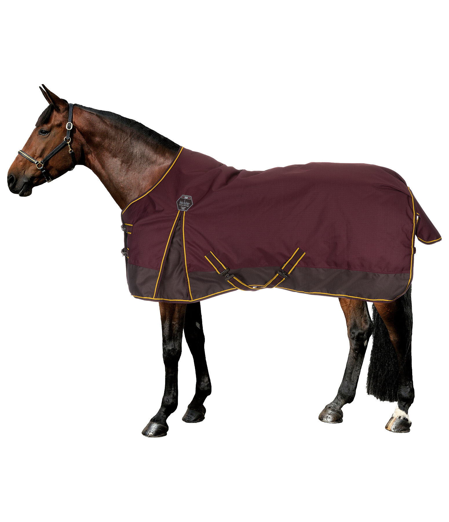 Dwukolorowa, odporna na rozdarcia, wodoodporna i oddychająca derka zewnętrzna (3000 mm słupa wody) wykonana z wytrzymałego materiału ripstop o grubości 1200 denierów. Obfite wewnętrzne wypełnienie zapobiega powstawaniu punktów nacisku w okolicy kłębu. Lekkie wypełnienie o gramaturze 50 g. Gładka, przyjazna dla sierści podszewka. Podwójne, regulowane zapięcie na klatce piersiowej z karabińczykami i dodatkowym klinem dla optymalnego trzymania. Głębokie kliny dla idealnej swobody ruchu. Wyposażony w pasy krzyżowe, urządzenie do opcjonalnego mocowania pasów na nogi i regulowany pasek na podudzie. 100% poliester.