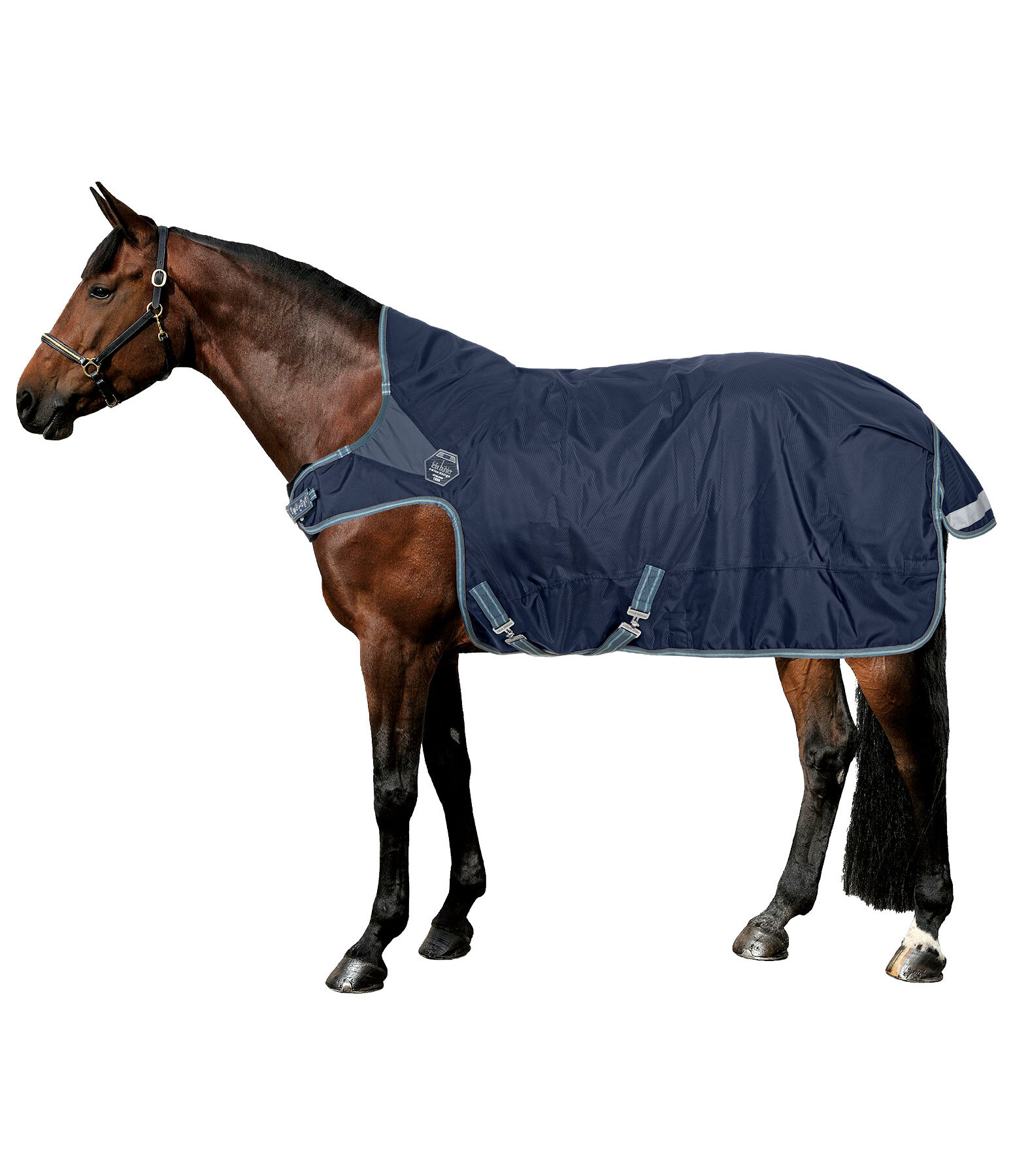 Wydajna i wyjątkowo odporna na rozdarcia derka do karuzeli dla koni z wysokim kołnierzem wykonana z nylonu 1680 denierów o bardzo wysokiej wodoodporności (5000 mm słupa wody) i doskonałej oddychalności. W porównaniu do poliestru nylon jest znacznie bardziej miękki i jedwabisty, z połyskiem. Jednocześnie nylon jest wielokrotnie bardziej elastyczny niż poliester, co zapewnia lepszą odporność na rozdarcie. Odciążające wkładki rozciągliwe w okolicy ramion/szyi wykonane z elastycznego, wysoce hydrofobowego materiału softshell oraz obszerne wycięcie na ramiona zapewniają optymalną swobodę ruchu, gwarantują wyjątkowe dopasowanie i zapobiegają powstawaniu klasycznych, niepożądanych punktów nacisku. Zapięcie na klatkę piersiową jest dodatkowo wyściełane miękką, anatomicznie ukształtowaną wkładką z gumy chloroprenowej. Obfite wewnętrzne wyściełanie przy wysokim kołnierzu dodatkowo minimalizuje nacisk w okolicy kłębu. Gładka, przyjazna dla sierści podszewka. Regulowane pasy krzyżowe i urządzenie do opcjonalnego mocowania pasków na nogi. Regulowany pasek na ogon i klapa na ogon z odblaskowymi paskami i odblaskową lamówką dookoła. Materiał zewnętrzny: 100% nylon, podszewka i wypełnienie: 100% poliester.