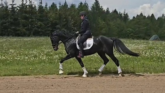 Bardzo ładny ruch, fajny galop, bardzo przyjemny do jazdy. Odważny, nie jest płochliwy. W profesjonalnym treningu ujeżdżeniowym od listopada, obecnie na poziomie klasy P, robi elementy klasy N i pierwsze podejścia do lotnych zmian. Obiecujący prospekt sportowy z bardzo dobrym ujeżdżeniowym rodowodem.